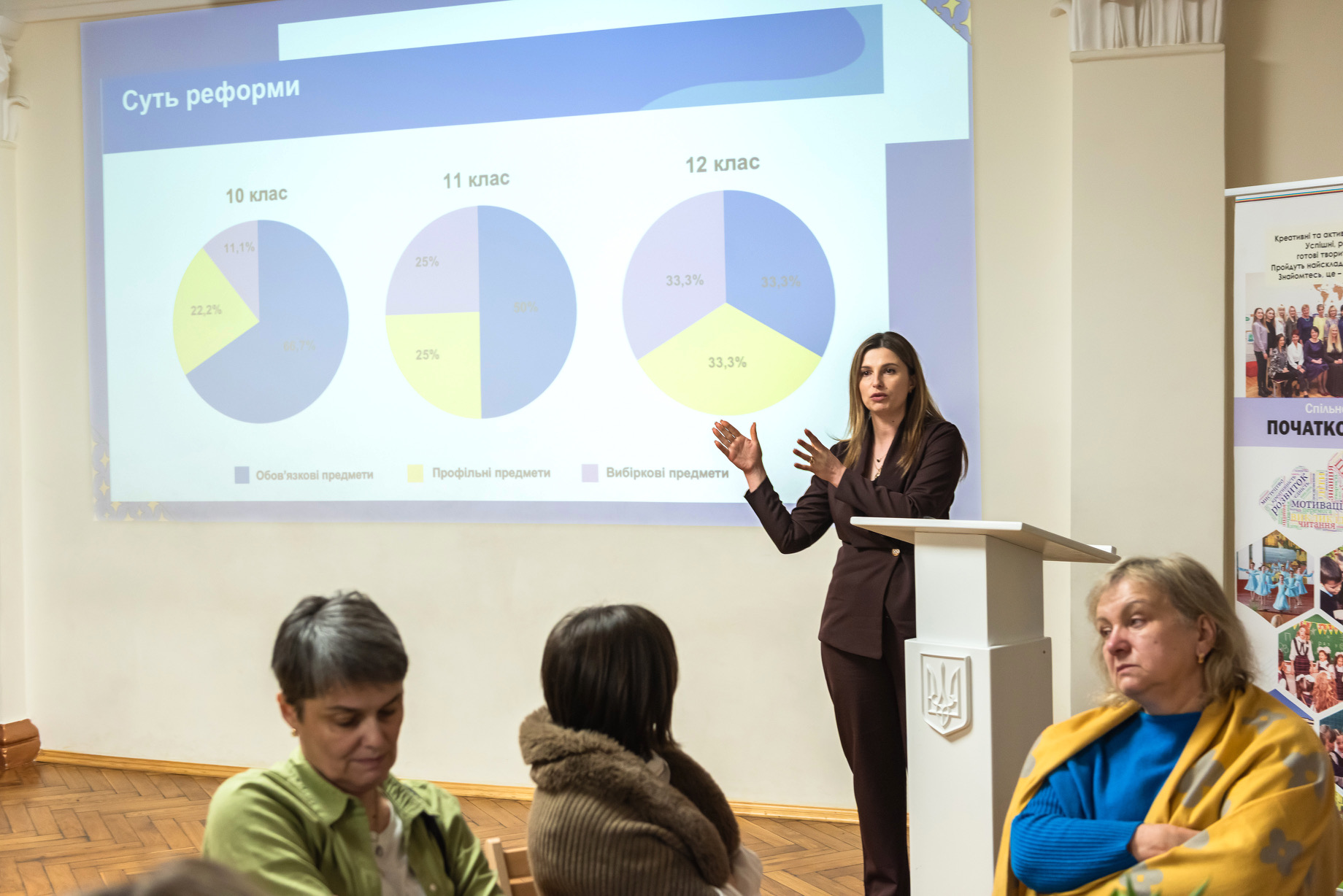 Заступник директора Марія Штокало представила структуру можливих профілів старшої школи та пояснила механізм формування індивідуальних освітніх траекторій учнів.